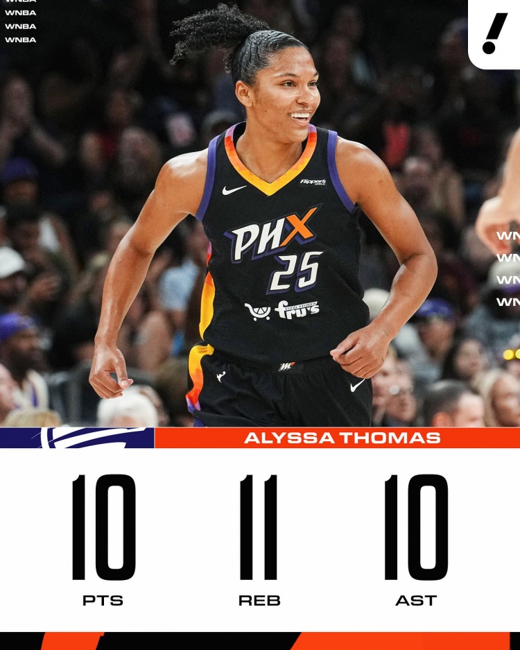 水星队核心艾莉莎-托马斯斩获10分11篮板10助攻的全能数据,完成个人本赛季第8次三双表现,再度刷新了她上个月刚创造的7次三双纪录。原纪录由她本人在2023赛季创造的6次三双保持。