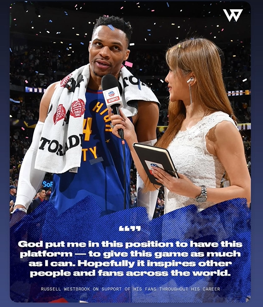 “上帝把我放在这个位置,让我拥有这个平台尽我所能地回馈这项运动,希望这能激励全世界的其他人以及球迷。”威斯布鲁克当时说道。